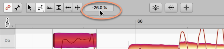 Bei den Werkzeugen für Modulation und Drift zeigt der Inspektor einen Prozentwert an. 100 % entspricht der Original-Modulation bzw. Original-Drift, 0 % einer begradigten Kurve und -100 % einer umgekehrten Kurve mit gleichem Hub wie bei der Originalkurve. Haben Sie mehrere Noten mit unterschiedlichen Werten selektiert, zeigt das Feld einen Strich und beim Ziehen des Werts die relative Änderung an.