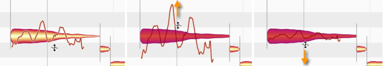 Klicken Sie eine Note mit dem Werkzeug an, halten Sie die Maustaste gedrückt und ziehen Sie die Maus nach oben oder unten. Die bearbeitete Note kann auch Teil einer Mehrfachselektion von Noten sein, in diesem Fall bearbeiten Sie alle selektierten Noten simultan. Sie können sehen, wie sich die Tonhöhenkurve verformt:
