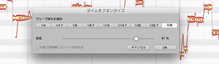 時間クオンタイズ: 意図された拍または選択されているグリッドの直近の線にノートを移動します。