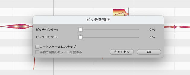 ピッチ補正:ノートを直近の半音に移動します。移動範囲は元の音の音程がどれだけ外れているかにより異なります。2つ目のスライダーで、ノート内のピッチドリフトを抑制できます。