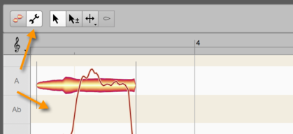 Now click the wrench (spanner) icon next to the toolbox of the Note Editor to activate Note Assignment Mode. The background in the Note Editor changes color to show that you are no longer in normal Edit Mode but have switched to Note Assignment Mode. In Note Assignment Mode, what you see and hear is the original state of the audio source; any editing you may have performed on it previously is ignored here.