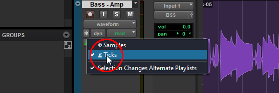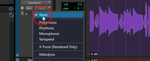 Wenn Sie Melodyne auf mindestens einem Clip der Spur verwenden, wir Melodyne hier automatisch ausgewählt. Voraussetzung für Tempoanpassungen ist, dass die Clips auf tick-based und nicht sample-based gestellt sind.