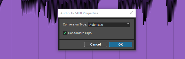 Das ist nun entscheidend besser geworden. Zwar wird nach wie vor ein Dialog sichtbar, aber wenn Sie hier aber nichts weiter verändern (die Einstellung also bei “automatisch” belassen) und einfach OK klicken, dann wird genau der von ihnen editierte Noten-Zustand als MIDI-Noten verwendet und eben nicht mehr eine komplett neue Analyse der Originalaufnahme ausgeführt.