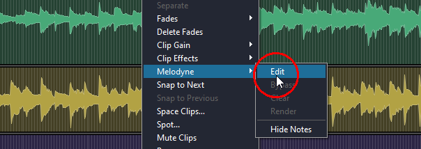 Zunächst müssen Sie bestimmen, auf welchen Clips oder Spuren Sie Melodyne einsetzen wollen. Selektieren Sie dazu mit den üblichen Selektionstechniken einen einzelnen Clip oder mehrere Clips, wahlweise auf einer oder auf mehreren Spuren. Wählen Sie dann im Kontextmenü oder über das Clip-Menü den Befehl Melodyne > Bearbeiten (Shortcut: Shift+Ctrl+A). Melodyne wird dadurch auf allen selektierten Clips eingesetzt. Alternativ können Sie den rechtsklick auch auf den Spurnamen ausführen, dann wird Melodyne auf allen Clips dieser Spur eingesetzt.