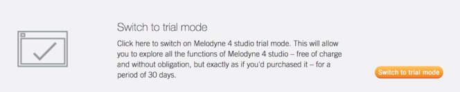 When you switch to trial mode, your Melodyne essential, assistant or editor will be transformed for 30 days – free of charge and without obligation - into Melodyne studio, the largest Melodyne edition, which contains the full range of Melodyne functions. You can use all these functions for 30 days without restriction, exactly as if you had purchased Melodyne studio. Trial mode can only be activated once on the same computer. To switch to trial mode, and each time you launch Melodyne studio during the trial period, you will need an Internet connection.