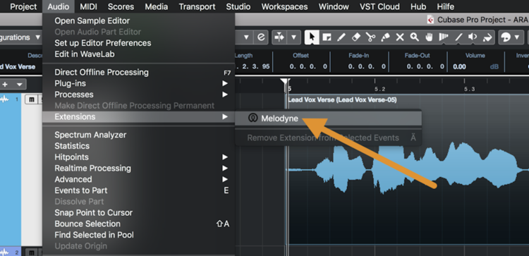 - either choose Audio > Extensions > Melodyne from the menu;