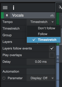 In Studio One’s Inspector (just to the left of the track list and accessible by clicking on the i button above the track list) you can select for each track between the options “Follow Tempo” and “Timestretch”. With regard to the option selected, Melodyne conforms with Studio One. All the following examples apply only when Timestretch has been selected for the track in question. If “Follow Tempo” or “Do Not Follow Tempo” are selected, no time stretching occurs.