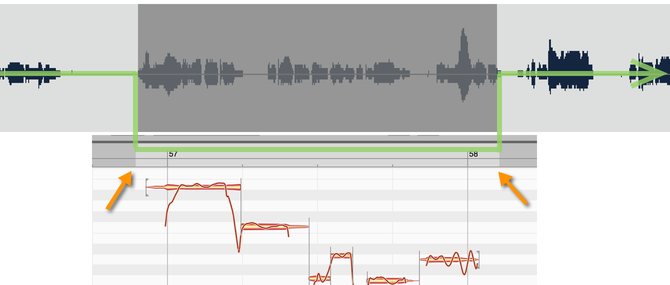 During playback, those passages that have been transferred to Melodyne will be played back by Melodyne; all others by the DAW. In other words, wherever it has material to play back, Melodyne’s signal will replace that of the original track.