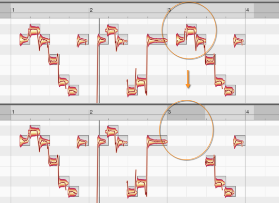To shorten a playback region, delete a few blobs and select Set Replace Ranges to Notes from the context menu of the Time Ruler. This command works not only at the borders of the playback region but also when you delete notes from the middle of the region – as shown in the following illustration.