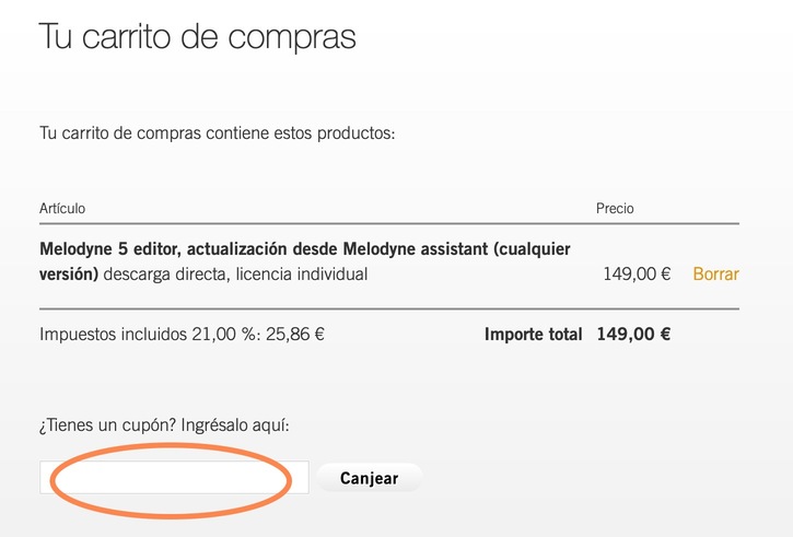 - El cupón solo es válido en la tienda web de Celemony (en www.celemony.com) y solo al comprar actualizaciones, o versiones superiores a la actual, de Melodyne o al agregar una estación de trabajo adicional a una licencia Melodyne existente. El cupón no se puede utilizar para la compra de ningún otro producto. Cuando el cupón se utiliza en la compra de un producto para el que es válido, se te acreditará el importe en cuestión, y, por tanto, se descontará del precio de compra.