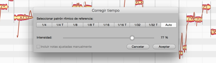 Corregir tiempo desplaza las notas hacia el pulso rítmico deseado (tú decides cuánto) o hacia la línea más cercana de la cuadrícula seleccionada.