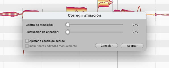 Corregir afinación, que desplaza las notas hacia el semitono más cercano (tú decides cuánto). Qué tan lejos se desplazan también depende de qué tan desafinadas estaban al principio. Con el segundo control deslizante puedes controlar la fluctuación de afinación dentro de las notas.