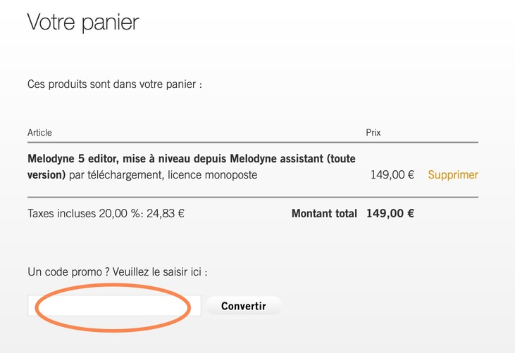 Dans notre boutique en ligne, placez d’abord la mise à jour de votre Melodyne existant ou la mise à niveau souhaitée dans votre panier ; puis, au moment de payer, saisissez le numéro de série de votre Melodyne 5 essential comme code de bon de réduction et cliquez sur « Convertir ».