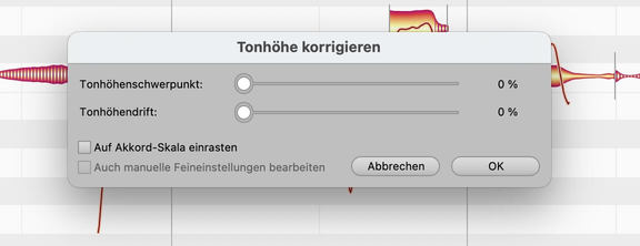 Tonhöhe korrigieren: Verschiebt die Noten mit wählbarer Intensität auf die richtige Tonhöhe. “Ausreisser” werden dabei stärker korrigiert als Noten, die nahe an der richtigen Tonhöhe liegen. Mit einem zweiten Regler können Sie die Drift korrigieren, das sind Schwankungen der Tonhöhe im Notenverlauf.