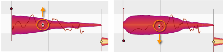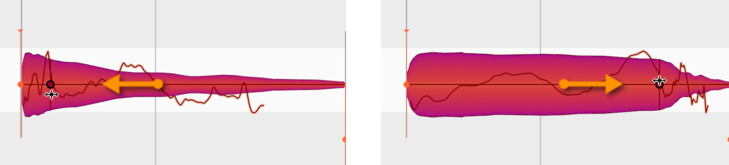 Bewegen Sie den Punkt nach unten, tritt das Gegenteil ein: Der Beginn der Note wird gedehnt – auch über ihren ursprünglichen sichtbaren Beginn hinaus – und langsamer abgespielt, der Rest dafür zunehmend schneller. Das Einschwingen wird weicher. Beachten Sie, dass der musikalische Startpunkt der Note, der durch den orangenen Anker repräsentiert wird, bei Änderungen von Attack Speed nicht verschoben wird. Der “gefühlte” Start der Note bleibt also unabhängig von der Einschwingzeit gleich, und auch das Ende der Note wird nicht verschoben.