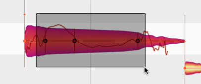 Auch das Attack-Speed-Werkzeug bearbeitet den Zeitablauf innerhalb einer Note: Es dehnt und verlangsamt den vorderen Teil der Note und beschleunigt dafür den hinteren Teil – oder umgekehrt. Das Einschwingen wird dadurch länger und weicher oder eben kürzer und härter. Der “gefühlte” musikalische Startpunkt der Note bleibt dabei unverändert, ebenso wie ihr Ende.