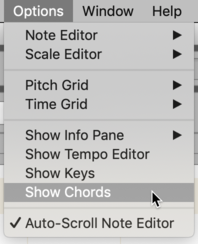 - Display the Chord Track (and the Key Track too, if you wish) by checking the relevant entries in the Options menu. Alternatively, you can click on the icons beneath the Time Grid Settings menu in the top right-hand corner of the Note Editor.