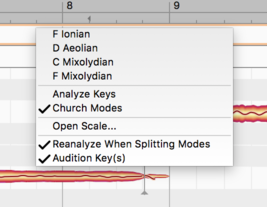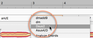 The context (right-click) menu of the Chord Track suggests alternatives for the chords detected:
