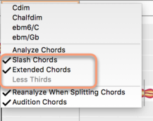 As well as choosing a naming convention for the display, you can also influence the complexity of the chords. For certain musical genres, you may prefer to make the lead sheet easier to read. The context (right-click) menu of the Chord Track offers the following options: