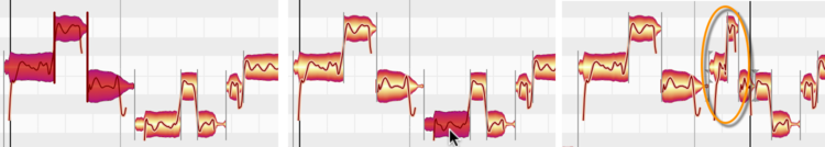 - If any notes are selected when the Paste command is executed, these are replaced by the contents of the clipboard. The pasted notes are stretched or squeezed until they fit exactly the range from the beginning of the first to the end of the last note of the selection. This is illustrated here: on the left are the notes to be copied; in the centre, a single selected note, which serves as the destination of the copy; on the right is the result after the paste is performed: The selected destination note has been replaced and the pasted notes squeezed just enough for them to fit exactly the space it occupied.