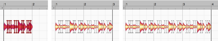 Their position is now determined by the cursor. And since, after the first paste, this was aligned with a quarter-note on the Time Grid (the first quarter-note after the pasted notes, to be specific), the effect of the second paste is that the original alignment of the notes relative to the gridlines is reproduced exactly, only further along the timeline. This behavior allows you to string together a succession of copies of the same passage, quickly and accurately – in order, for example, to create multiple iterations of a drum loop.