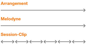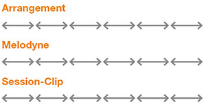 The upshot of all this is that it is impossible to record and subsequently play back the switching of clips on a track in Melodyne in any sensible way: if you switch clips during the transfer, Melodyne will still record the contents, but do so along the linear time axis that is determined by the arrangement. And the contents will be played back accordingly. It is therefore not possible to reproduce in Melodyne clip changes implemented in Live’s Session View, as Melodyne is always guided by Live’s linear Arrangement Time rather by that of individual clips.