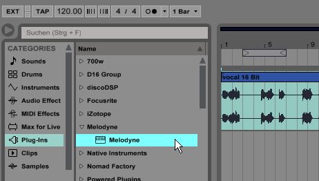 Load Melodyne as an insert effect into one of the audio tracks of the Live mixer. You will find the Melodyne Plugin in the Live browser under ‘Plug-Ins’ in the Melodyne or Celemony/Melodyne folder.