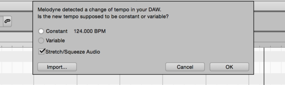 When you have set a constant tempo in Live – changed from 120 BPM to 124 BPM, for example – in Melodyne, when you next start playback, the button next to the Tempo display will flash to indicate that your attention is needed.