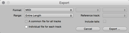 In the second line, select the Range (i.e. the portion of the timeline) you wish to export. The radio buttons below allow you to decide whether all the tracks should share a common MIDI file or whether a separate file should be created for each track.