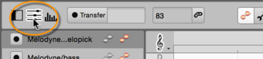In the plug-in: You see a header for every instance of Melodyne that you have opened in your project. There are no mute or solo buttons and no volume fader in the header, as these functions are already provided by your DAW. Instead you will see a Transfer button for every instance, and you can transfer-enable as many instances as you like swiftly from a single plug-in window.