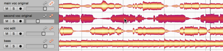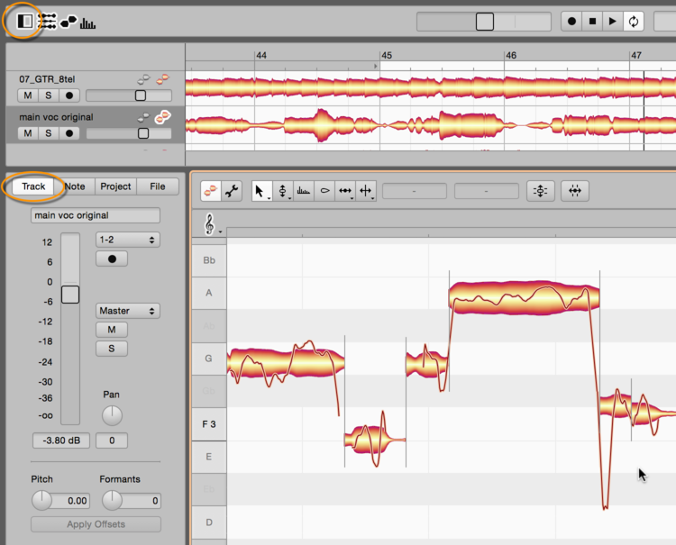 What happens if, while you are editing the vocal track, you notice something on the guitar track that you would like to alter? No problem. Just switch the guitar track to edit mode or double-click one of the gray blobs and immediately the two tracks will swap roles: it will be the guitar blobs that are colored and capable of being edited while the vocal blobs are displayed in gray in the background.