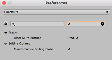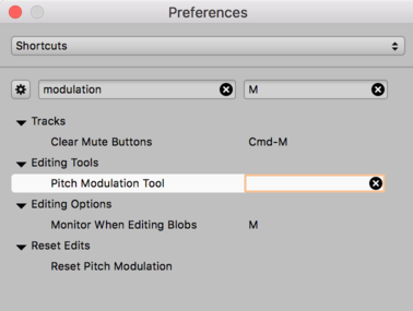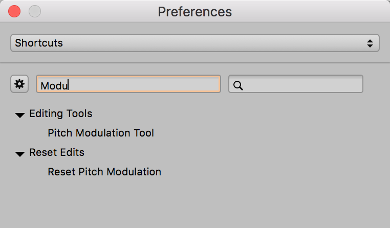 For example, suppose you wish to assign a keyboard shortcut to the command that activates the Pitch Modulation Tool. In that case, [M] (i.e. the “M” key on its own, standing here for ‘modulation’) would appear to be the obvious choice; or, if that key’s already taken, perhaps [Shift][M] or [Cmd][M]. To find out, just type “m” in the right-hand search box, and you will see what your options are: