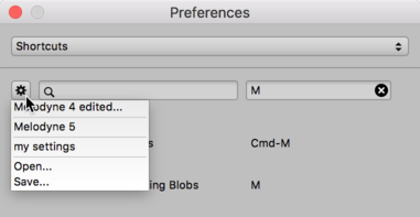 - “Open” and “Save”: These commands allow you to load an existing set of shortcuts or save the changes you have made to the hard disk. By saving your preferred shortcut assignments, you can take them with you when you change studio and load them into Melodyne there.