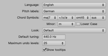 - Pitch labels: Determines which system is used to name the notes – i.e. (descending chromatically) English (C, B, Bb etc.), German (C, H, B etc.) or Latin (Do, Si, Sib etc.).
