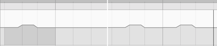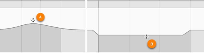 - B* (just below the curve): With this tool, you can raise or lower the tempo of the entire selection by a uniform amount, creating a plateau. At each end of the plateau there will then be an abrupt change of tempo. Whether you begin dragging from a point dead in the middle of the selection or a little to the left or right of center makes no difference with this tool.
