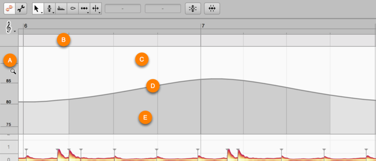 - E:* The area beneath the tempo curve. Here, too, the function of the tool varies, depending upon whether you simply click on the curve or do so after previously selecting a segment of it.
