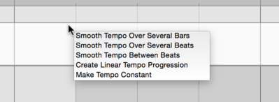 - Smooth Tempo Over Several Beats: This function spreads the tempo change evenly over a bar, producing virtually no change in the position of the start of each bar.