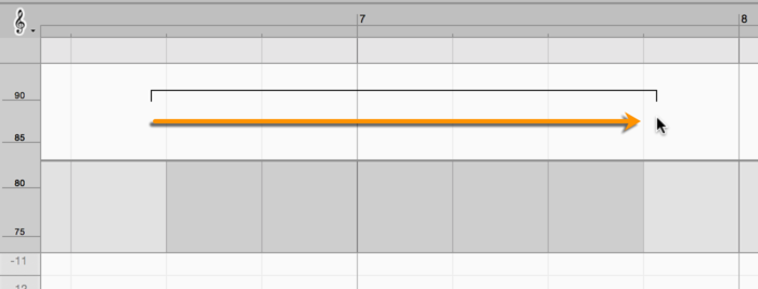 Select first the desired segment of the tempo curve by clicking in the white area above the curve and dragging horizontally with the standard arrow pointer. You can lengthen or shorten the selection subsequently by holding down the [Shift] key as you click or drag. The keyboard shortcut [Cmd]+A can be used to select the entire curve.