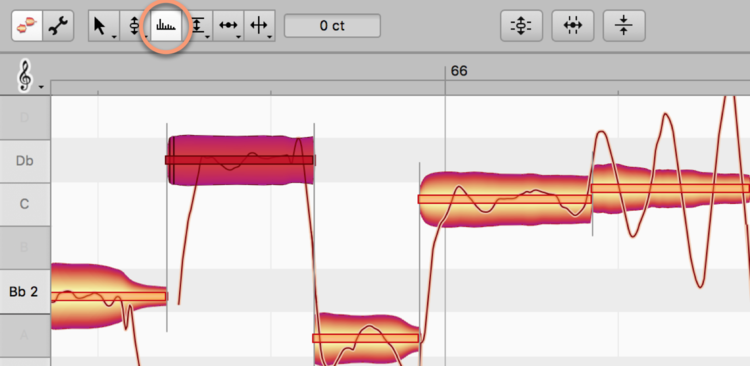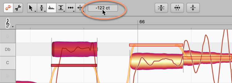The beams indicate the distance in cents (100 cents = 1 semitone) by which the formants have been transposed upwards or downwards. You can shift the formants a few cents (for the finest of nuances) or several thousand (for a drastic denaturing of the sound). Double-clicking on a note with the Formant Tool restores its formants (as well as those of any other notes selected) to their original pitches.