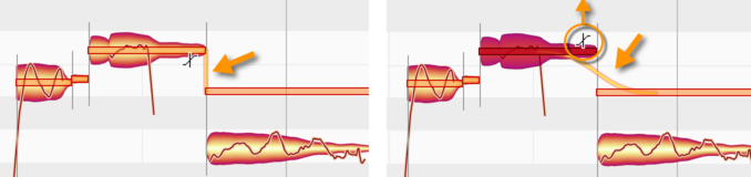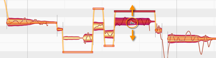 A thick orange line appears between the formant beams of adjacent notes as soon as you shift the formants of one note more, or in a different direction, than those of the other. This line represents the formant transition between the two notes.