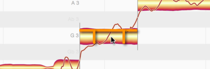 While you are dragging a note up or down, you will hear the frozen sound of the note at the point where you clicked. If, whilst dragging, you move the mouse to the right or left, you can put other parts of the note under the acoustic microscope. If you do not wish to monitor pitch changes in this way, uncheck the option Monitor When Editing Blobs in the Options > Note Editor sub-menu, which can also be accessed via the cog icon in the top right-hand corner of the Note Editor.