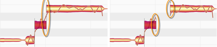 Notice that as you move the beginning or end of a note in this way, the preceding or following note, if adjacent, is also either stretched or compressed by the same amount to avoid either the two notes overlapping or white space (silence) appearing between them. This type of relationship exists whenever a pitch transition between consecutive notes has been detected. By moving the adjacent note as well, Melodyne ensures that discontinuities are avoided and the musicality of the phrasing is preserved.
