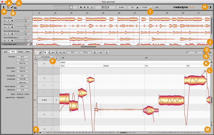 Melodyne’s user interface can be adapted to a variety of different work situations and demands. You will find the means of doing so in the Options menu as well as the interface itself.
