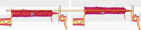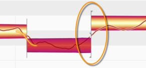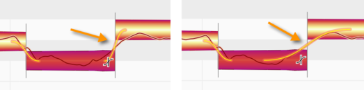 Quand une note en suit une autre et qu’une relation tonale entre elles deux a été détectée, une courbe de hauteur se dessine de l’une à l’autre, et dans la zone les reliant, une épaisse ligne orange est affichée, représentant la transition de hauteur.