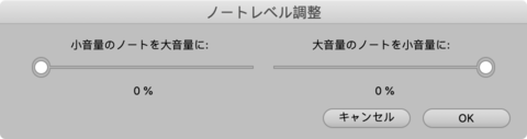 すでにその音量がマクロの影響を受けているノートを選択してから再びマクロを開くと、マクロウィンドウに表示されているパーセンテージは以前の表示とは異なることがあります。この場合、選択されている他のノートが異なっており、2つの選択対象の平均音量が異なり、そのため表示されていたパーセンテージ値が違っていたことが考えられます。