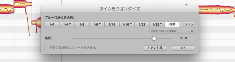 [OK]で変更内容を維持し、[キャンセル]で取り消します。 [タイムをクオンタイズ]マクロを使用したあとで、手動でノートを移動させてもかまいません。