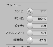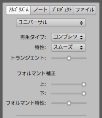 注:シンセが使用されている場合、ピッチとフォルマントのコントロールは同時使用できないため灰色表示となります。