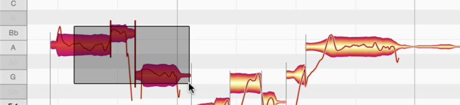 一定範囲のノートを選択するには、ピッチルーラー内をクリック&ドラッグします。