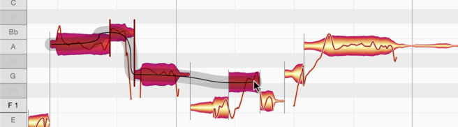 Shiftキーを押したままノートをクリックし、そのまま次のノートへとドラッグすると、Melodyneのスネーク選択モードがオンになります。 ノートを次々に選択していき、選択範囲にノートを追加することができます。