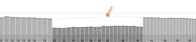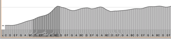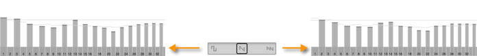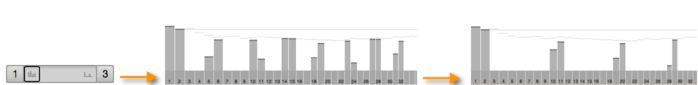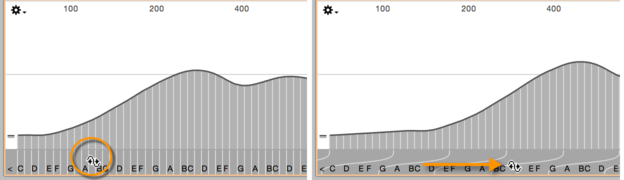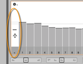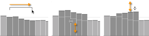 - 選択範囲内の全てのバーの高さを同じ量だけ調整するには、選択範囲内の中間色のエリア(最下部の暗い部分ではなく)を上下にドラッグします。選択範囲のすぐ上の位置(マウスポインターの形が変化する部分)からドラッグすると、ポインターに一番近いバーが最も遠い位置に移動し、最も遠い位置のバーが次第に近い位置に移動します。
